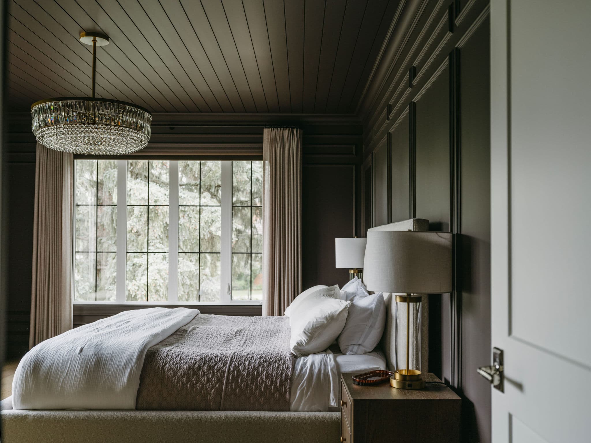 Elsewhere, the mood deepens: a Kent Tufted Sofa in plush green velvet transforms the lounge into a moody retreat—part reading nook, part speakeasy. A classic Bernhardt wing chair in brown leather plays counterpoint, its heritage shape grounding the jewel-toned space. In the primary bedroom, a custom Alex Bed by Cottswood Collection softens aubergine-hued panel walls, marrying tradition with modern textile warmth.
