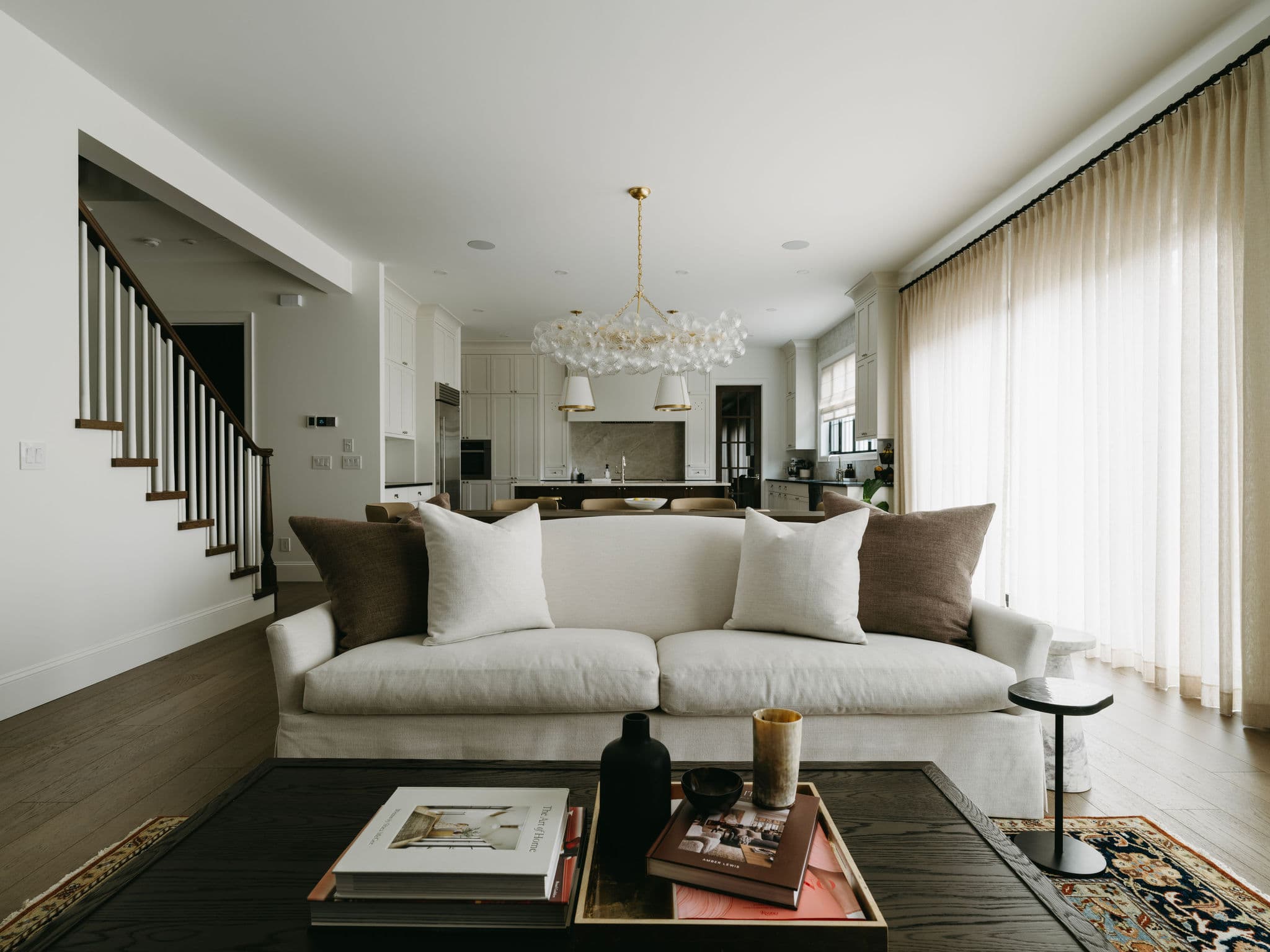 In the great room, the Willow sofa by Hickory Chair, designed by Suzanne Kasler, anchors the space with its dressmaker skirt and gentle curve, refreshed in a light-toned performance fabric that tempers elegance with everyday livability. Flanking it are Jules swivel chairs, their enveloping form and hand-tied suspension embodying quiet luxury.